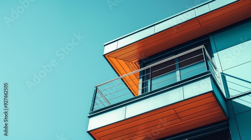 Modern Architecture Detail. Orange and Teal Building Facade with Balcony on a Sunny Day