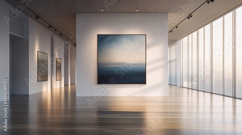 Modern art gallery featuring contemporary paintings illuminated by natural light