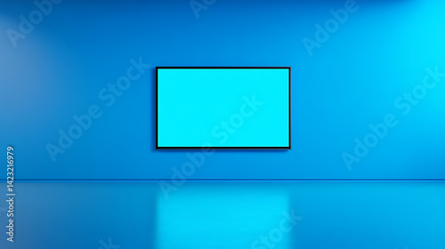 Modern art gallery setting featuring a prominent blue framed blank canvas on vibrant blue wall