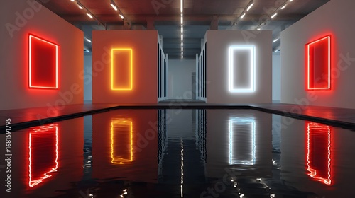 Modern Art Installation Featuring Colorful Lights and Reflections in Contemporary Gallery Space