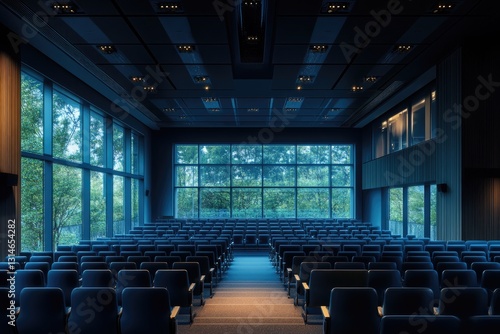Modern Auditorium Interior with Large Windows and Rows of Empty Blue Chairs