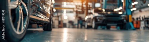 Modern automotive workshop with cars on lifts and equipment, captured in warm lighting. Perfect representation of car maintenance and repair.