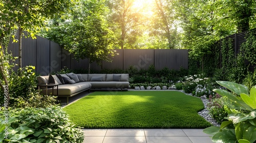 Modern backyard design with wide lawn and outdoor sofa, surrounded by green vegetation. Sunlight filters through trees, creating a relaxing atmosphere in harmonious home architecture.