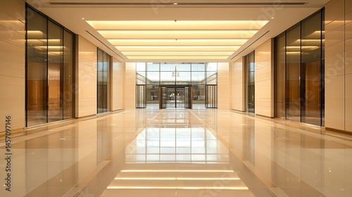 Modern bank office hall empty with large glass partitions minimalistic interior soft ambient lighting clean and open layout.