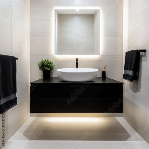 Modern Bathroom Illuminated Mirror, Black Vanity and White Vessel Sink , Bathroom, Interior