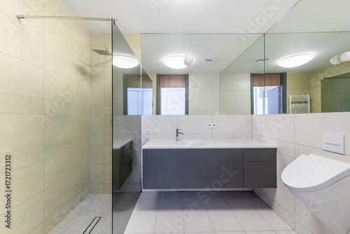 Modern Bathroom Interior with Mirrors and Minimalist Design Elements