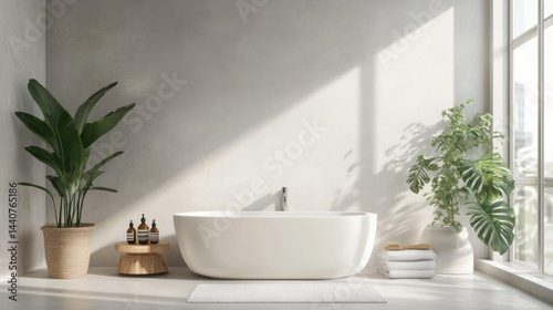 Modern bathroom interior with tropical plants and natural light.