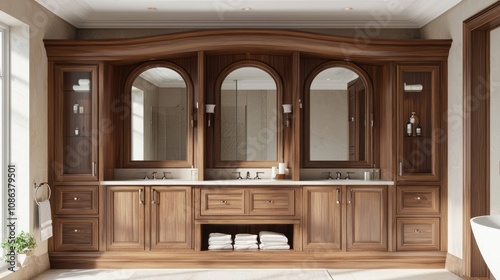 Modern bathroom with wooden cabinets, dual sinks, and arched mirrors, light background. Contemporary home or hotel concept. 3D Rendering