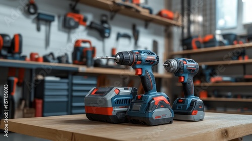 Modern Battery Operated Power Tools on a Wooden Workbench Display