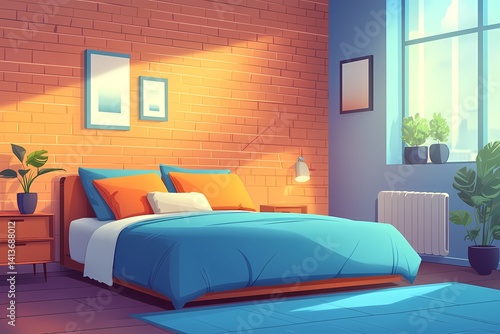 Modern Bedroom Decor with Cozy Atmosphere: Blue Colors and Natural Light Enhance Brick Wall Aesthetics