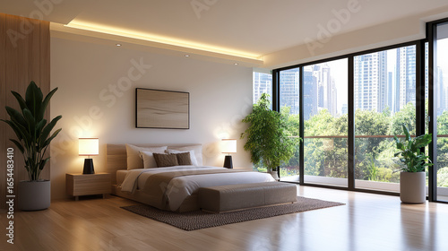 Modern bedroom design with large windows showcasing city view, featuring plants and soft