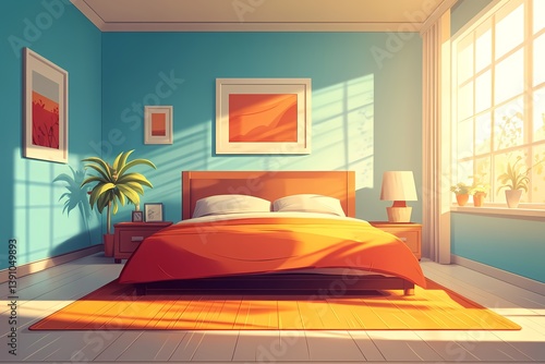 Modern Bedroom Interior Design. Vibrant Blue Walls, Natural Light & Cozy Decor
