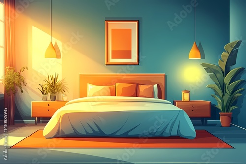 Modern Bedroom Interior Design with Blue Walls and Wooden Bed. Cozy, Elegant Home Decor with Lighting and Plants
