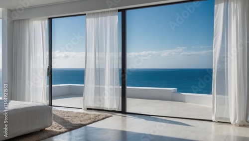 Modern Bedroom Interior with Panoramic Ocean View Through Glass Doors