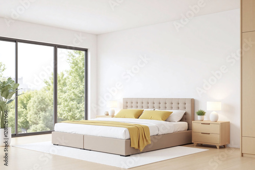 modern bedroom large bed beige headboard white comforter pillows
