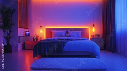 Modern bedroom with a king-size bed, nightstands, and a rug. The room is lit with orange led strips and hanging light bulbs.