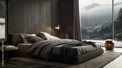Modern bedroom with a minimalist platform bed, soft gray bedding, and a stylish floor lamp beside a large window