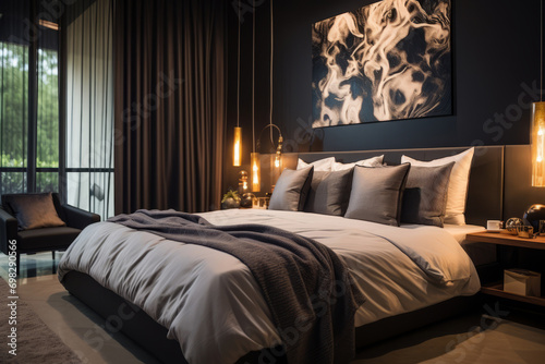 Modern bedroom with a pillow top bed and linen linens. Generative AI
