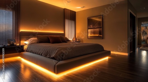 Modern bedroom with ambient lighting and stylish decor