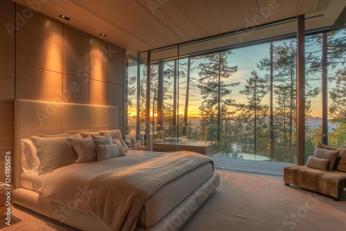 Modern bedroom with floor-to-ceiling windows offering stunning sunset views over a forested landscape