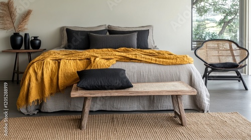 Modern bedroom with linen bedding, throw, and wooden bench.