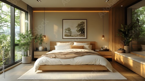 Modern bedroom with soft lighting, neutral bedding, and wall-mounted art, showcasing a minimalist aesthetic