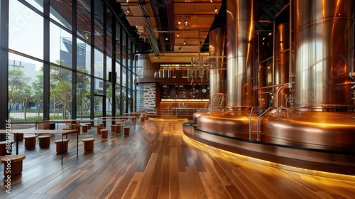 Modern beer production in Brazil, with advanced equipment and vibrant design, in a state-of-the-art Brazilian brewery, highlighting innovation and culture.