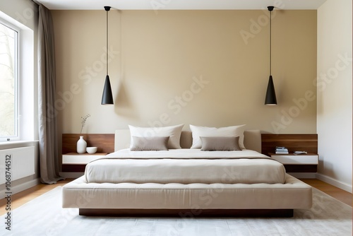 Modern beige bedroom with a platform bed and empty wall with copy space.