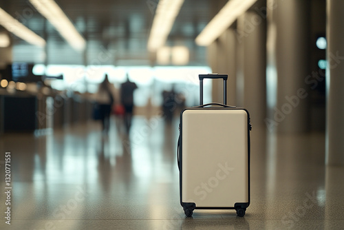Modern beige suitcase in airport terminal waiting area trip travel flight summer luggage baggage