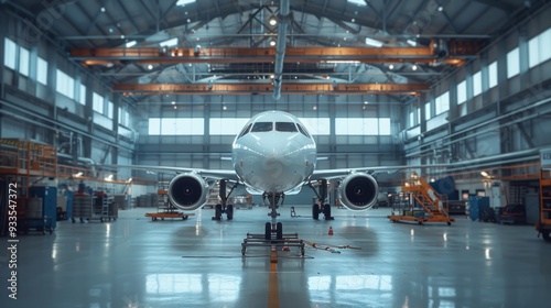 modern, big passanger modern aircraft in the hangar, in sunlight