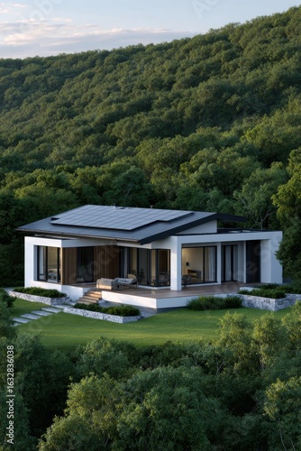 Modern Biophilic Residence - Stylized 250 Photorealistic 2:3 Render of Eco Home with Solar Roof in Lush Forest