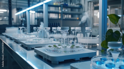 Modern biotechnology laboratory with scientific equipment and plant samples, representing advanced research and experimentation.