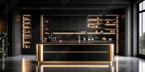Modern Black Kitchen Design with Gold Accents and Soft Lighting