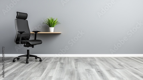 Modern Black Office Chair in Minimalist Home Office Setting with Grey Walls and Light Wood Shelf