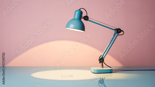 Modern blue desk lamp with adjustable arm illuminating on pink background