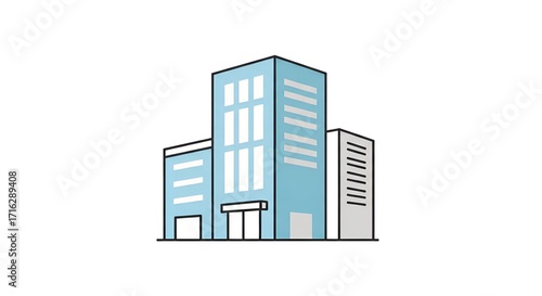Modern blue glass office building with clean lines and white accents