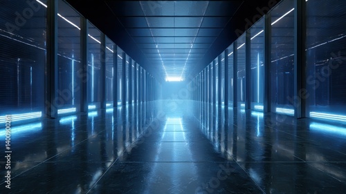 Modern blue hallway with glossy tiles and futuristic architectural style.