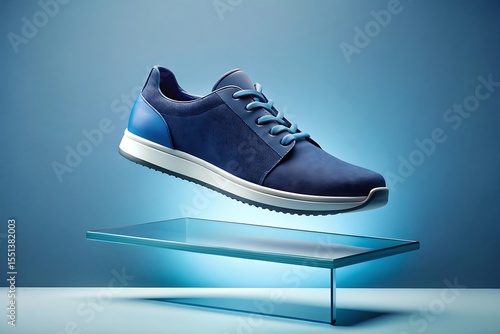 Modern Blue Sneaker, Minimalist Product Shot, Stylish Footwear, Clean Design, Levitation Effect, Glass Platform, Blue Background, Contemporary Advertising.