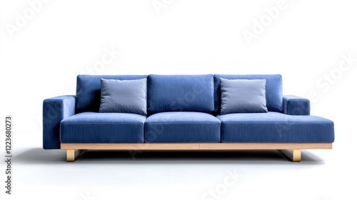 Modern blue sofa, wooden legs, studio shot, white background, home decor