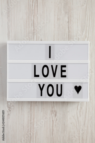 Modern board with text 'I Love You' on a white wooden background, top view. Flat lay, overhead. Valentine's Day 14 February.
