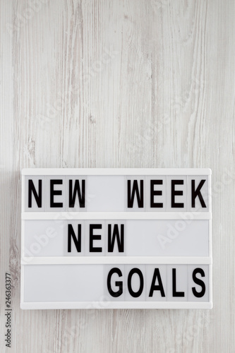 Modern board with text 'New week new goals' over white wooden surface, top view. From above, flat lay, overhead. Copy space.