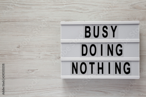 Modern box with text 'Busy doing nothing' on a white wooden background, top view. From above, flat lay, overhead. Copy space.