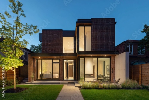 Modern brick house with expansive glass windows showcases elegant design and lush garden in evening light, located in a tranquil neighborhood
