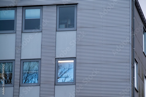 Modern building exterior showing windows and metal cladding reflecting urban environment