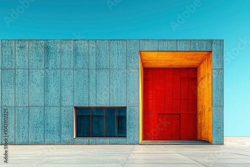 Modern building exterior with red door and blue wall