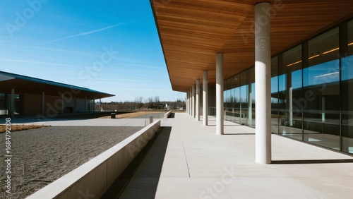 Modern building with a covered walkway and large glass windows under a clear blue sky.
