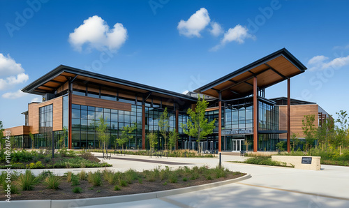 Modern building with large windows and wooden accents, surrounded by landscaping.