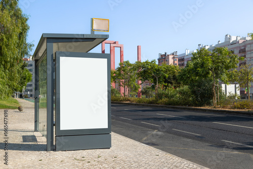 Modern bus stop in Lisbon with a large empty billboard designed for advertisements. The scene captures an urban street with trees, residential buildings, and a clear blue sky.