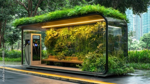 Modern bus stop shelter with green roof and interior plants, urban setting.