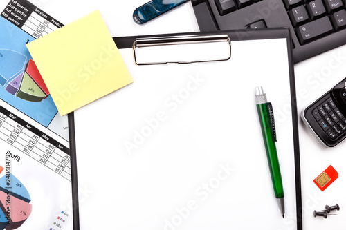 modern business desk with various office stationery
